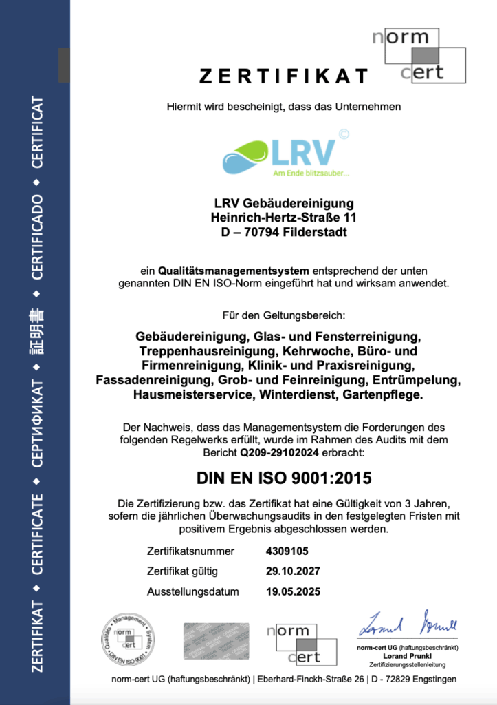 Jessica Pires2021-09-27Ich kann die LRV Gebäudereinigung nur weiterempfehlen. Habe sehr schnell ein Termin bekommen und es lief alles einwandfrei ab. Außerdem ist der Service sehr gut. Es ist ein sehr zuverlässiges Unternehmen und das Preis-Leistungsverhältnis ist top. Werde bei weiteren Arbeiten immer wieder auf LRV Gebäudereinigung zurückgreifen.